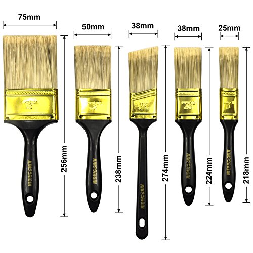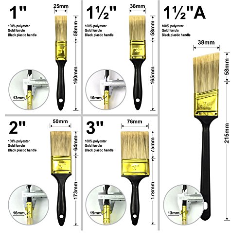 - polyester and gold ferrule with 5 different sized brushes to suit your painting needs.1 inch 1.5inch 1.5 inch angle sash 2 inch 3 inch