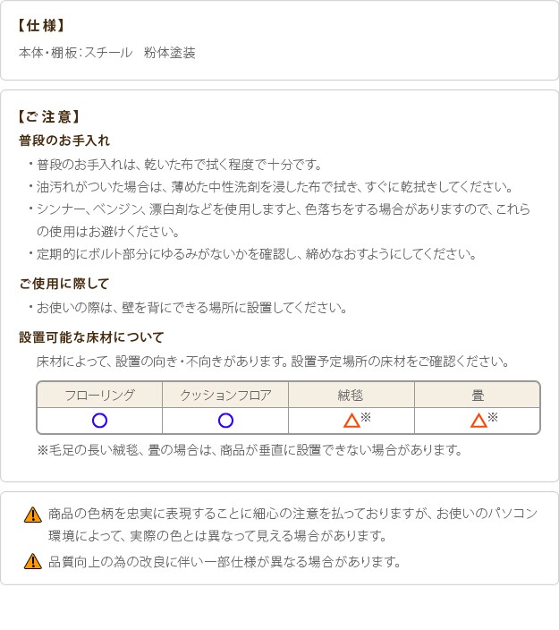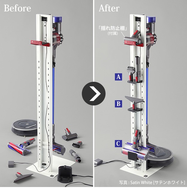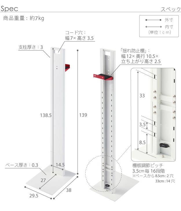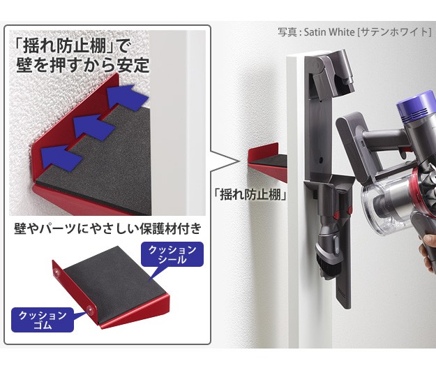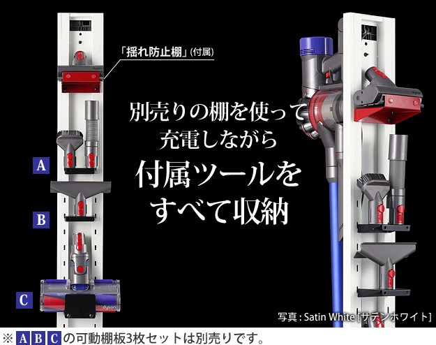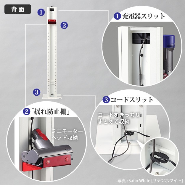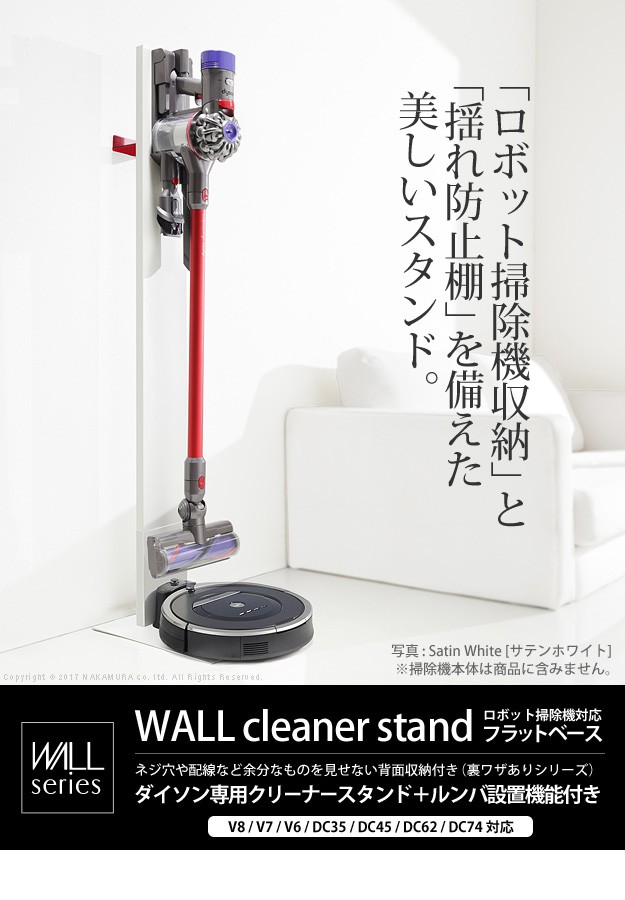 ※メーカー直送のため代金引換はお受けできません。※沖縄・一部離島は別途送料がかかります。お見積もりいたしますのでお問い合わせ下さい。【カラーバリエーション】サテンホワイト・サテンブラック・ウォールナット【仕様】本体・棚板:スチール◎組立品【サイズ】対応ダイソン掃除機:V8,V7,V6,DC62,DC74,DC45,DC35対応掃除機:iRobot Roombaシリーズ・Panasonic RULOシリーズ・HITACHI minimaruシリーズ幅29.5x奥行40x高さ139cm重量:約7g棚板ピッチ:下から8.5cm、3.5cmピッチ16穴本体支柱サイズ:幅14.5x奥行3x高さ138.5cmベース(有効):幅29.5x奥行38(27)cm・厚み3mm固定棚板サイズ:幅12x奥行10.5x立ち上がり高さ2.5cmクリーナー取付け時下高さ:約15cm(機種によって異なる)株式会社ナカムラ(M0500085)