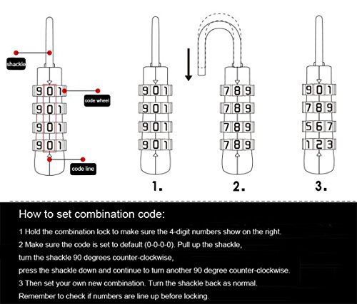 -. Feature : ★DURABLE MATERIALS: Made of zinc alloy and plated steel. Tough, small, lightweight and durable.Better keep your own belongings. / ★TSA APPROVED WITH ALERT INDICATOR: Allows your lage to be inspected by special authorities without damages to your lock or bag. Alert indicator lets you know that your bag has been opened and inspected. / ★HARD TO CRACK & GOOD SECURITY: 4 digit number combinations, added security,keep your personal possessions, like tablets, phones or valuables, safe and secure in many situations. / ★WIDELY USED: lage, backpacks, bags, small cabinets, briefcases, computer bags , etc. / ★100% SATISFCATION GUARANTEE: Backed by Amazingbuy Store 30 days Money Back Guarantee with 3 years free replacement warranty.