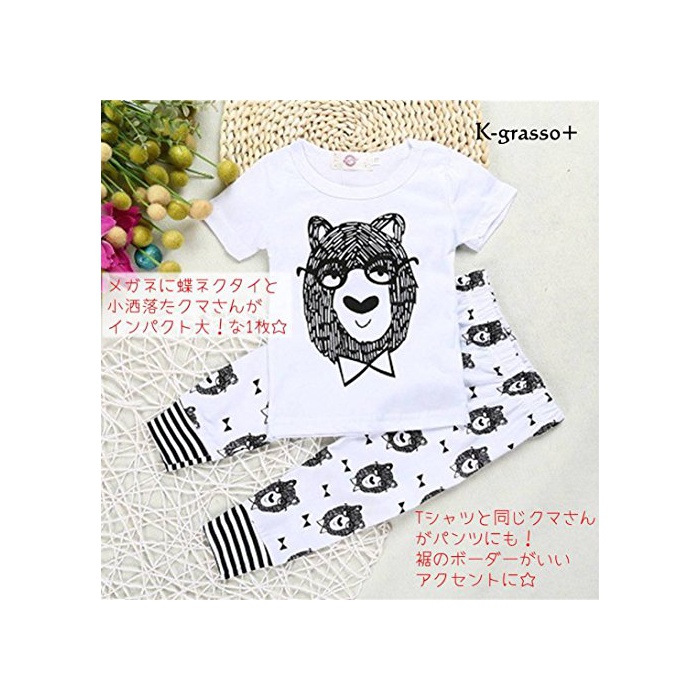 K-grasso+ (K 그라《소》) 키즈 T셔츠 & 팬츠 상하 2점 세트 곰 긴 소매 반소매 웨스트 고무 사양 셋업 아동복 베이비 파자마 평상복 유니섹스 70 80 90 100 110