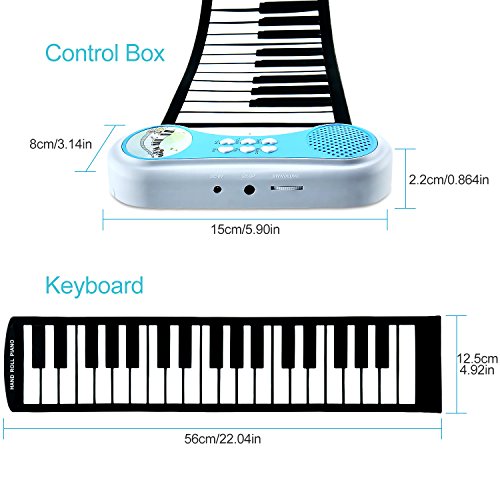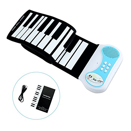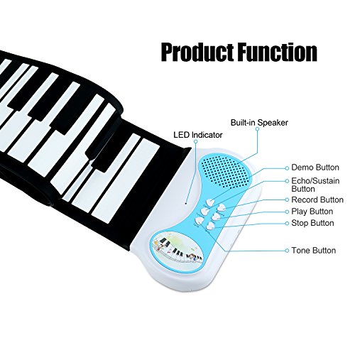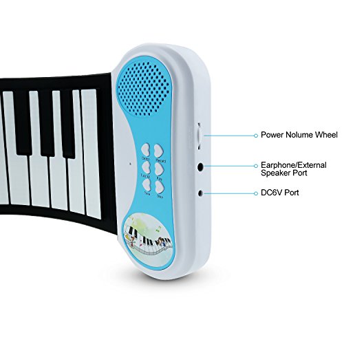 Soft & Comfortable: Made of Silicone Rubber torch soft and comfortable and sensitive keyboard. Features multiple keyboard tones and demo songs, record & playback, echo/sustain, built-in speaker with volume control, and audio output.;Flexible Electronic Keyboard Piano with 37 standard keys, 8 tones and 6 demo songs. Due to the soft silicone that the keyboard is made of, there are times when compound sounds are produced due to cross-feedback or vibrations registering on adjacent keys.;EASY TO PICk UP & STORAGE: Small and can be hand-carried, it can also be rolled up for easy storage in hand bag or carrying case. Piano is flexible so when you're done playing, you can roll it back up into its box. Portable - take it with you when you go outdoors!;GREAT GIFT :It can also use Audio Jack 3.5mm headset will enable children to learn to respect other people's Silence speech.37-keys roll up piano makes a great gift to Kids between 3 - 6 years old. This roll up piano is so easy to use that every Kid will want to play it.;Perfect Educational Piano FOR Kids' Beginner: It can put the music into the game and let them feel the rhythm and the beat during the process of playing.Kids can also exercise hand-eye coordination, motor coordination, puzzle, rich imagination and emotions when playing it.