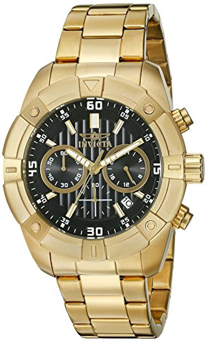 -. Binding : Watch -. Brand : Invicta -. Department : mens -. EAN : 0886678263165 -. Feature : Round watch with black textured dial wit luminous hands and date window between four and five o'clock / Chronograph with 60-second, 60-minute, and 24-hour subdials / 44 mm 18k gold-plated stainless steel case with synthetic-sapphire dial window / Japanese quartz movement with analog display / 18k gold-plated stainless steel band with fold-over clasp with safety / Water resistant to 100 m (330 ft): In general, suitable for swimming and snorkeling, but not scuba diving -. Label : Invicta -. Manufacturer : Invicta -. Model : 21470 -. MPN : 21470 -. PartNumber : 21470 -. ProductGroup : Watch -. ProductTypeName : WATCH -. Publisher : Invicta -. Studio : Invicta -. Title : Invicta Men's 21470 Specialty Analog Display Japanese Quartz Gold-Plated Watch -. UPC : 886678263165