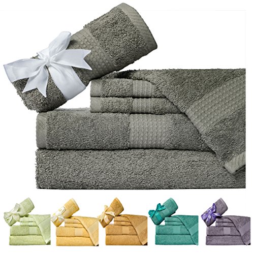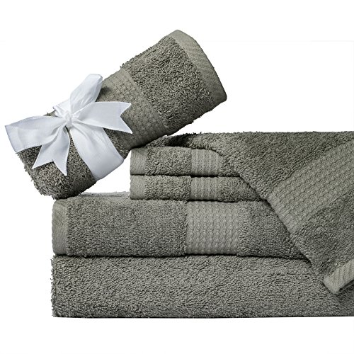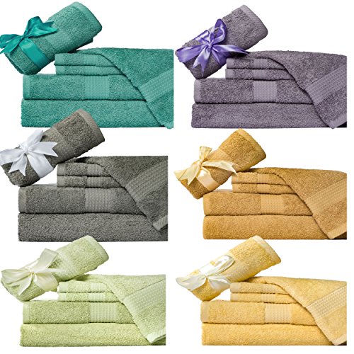 Studio : NG Publisher : NG Product Description Add a hint of color to your bathroom with the 100% superior cotton hotel spa quality 6-piece bath towel set. This set features a soft, 100-percent cotton construction and is available in a variety of colors to complement your decor. Set inculeds two oversized bath towels, two hand towels and two wash cloths. These six-piece cotton towel set brings a sense of sophistication and classic charm to any bath. Give this luxury bath towel set to a newly married couple as a gift to outfit their new home, or send your child to college with everything they need to feel right at home in their dorm bathroom. Made from 100-percent cotton, the six-piece towel set not only feels soft to the touch, but it also stands up over time and long-lasting durability. Set includes 2 bath towels, 2 hand towels and 2 wash cloths Made with 100% cotton Solid pattern Available in Teal Aqua, Gold Tan, Purle Grey, Pale Green, Butter Yellow, Grey Pine Machine washable Dimensions: Bath towels: 30 inches wide x 56 long inches Hand towels: 16 inches wide x 28 long inches Wash cloths: 13 inches wide x 13 long inches 0