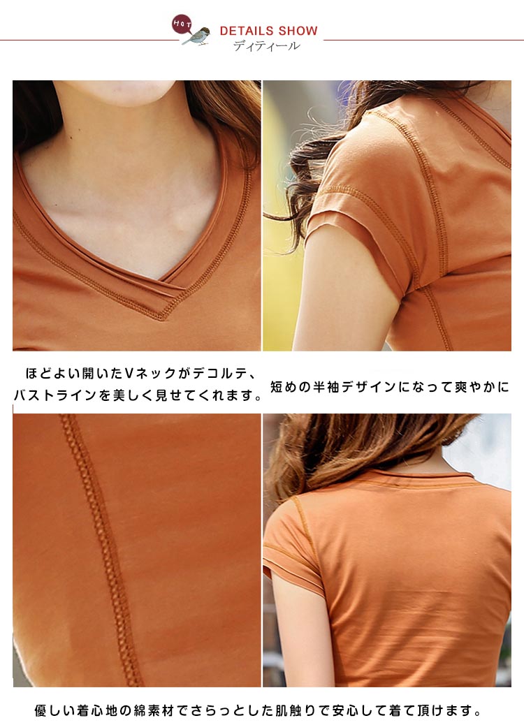 | シンプルながら実用系定番アイテム。毎夏に欠かせない無地tシャツの登場です。ほどよい開いたVネックがデコルテ、バストラインを美しく見せてくれます。短めの半袖とウエスト部分のくびれがボディーラインを美しく魅せ、女性らしいデザイン。カラーはベーシックの全5色展開。カジュアルからキレイめまでお使い頂ける、肌に優しいです☆年中活用できるので、何枚あっても便利なアイテムです。 | |