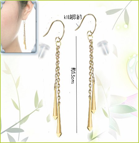 -. Feature : 18金イエローゴールド/YG18K掛け式フック仕様(18k刻印あり)/国内産。 / ティアドロップモチーフ/パーツ/合金/ゴールドトーン/18mmx3mm      チェーン/合金/ゴールドトーン / サイズ:約縦5.5cm。  やや長めのチェーンの下に 細長いティアドロップパーツをあしらったロングピアス。 / 存在感があり、お洒落のアクセントにぴったりです / シンプルかつ美しい仕上がり  身のこなしとともにキラキラとした輝きを演出します!!