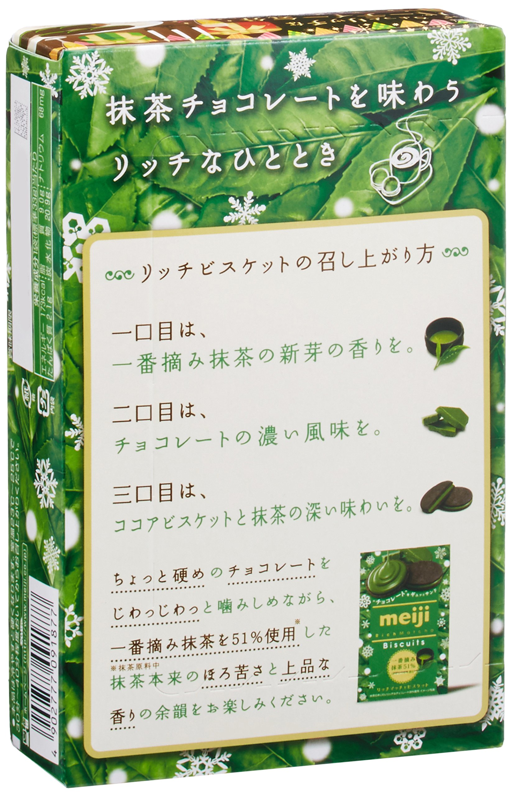 Rich matcha taste of chocolate is sandwiched by cocoa biscuits.