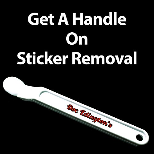 GET A HANDLE ON LABEL REMOVAL! Doc Edington's plastic sticker remover has a strategically angled handle that makes this label removal tool more effective with less work than with a straight handle.