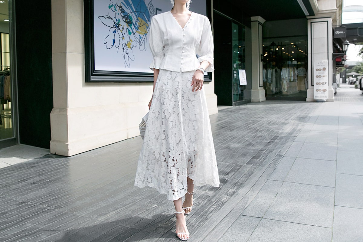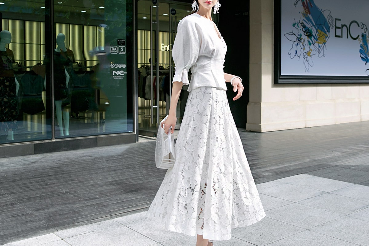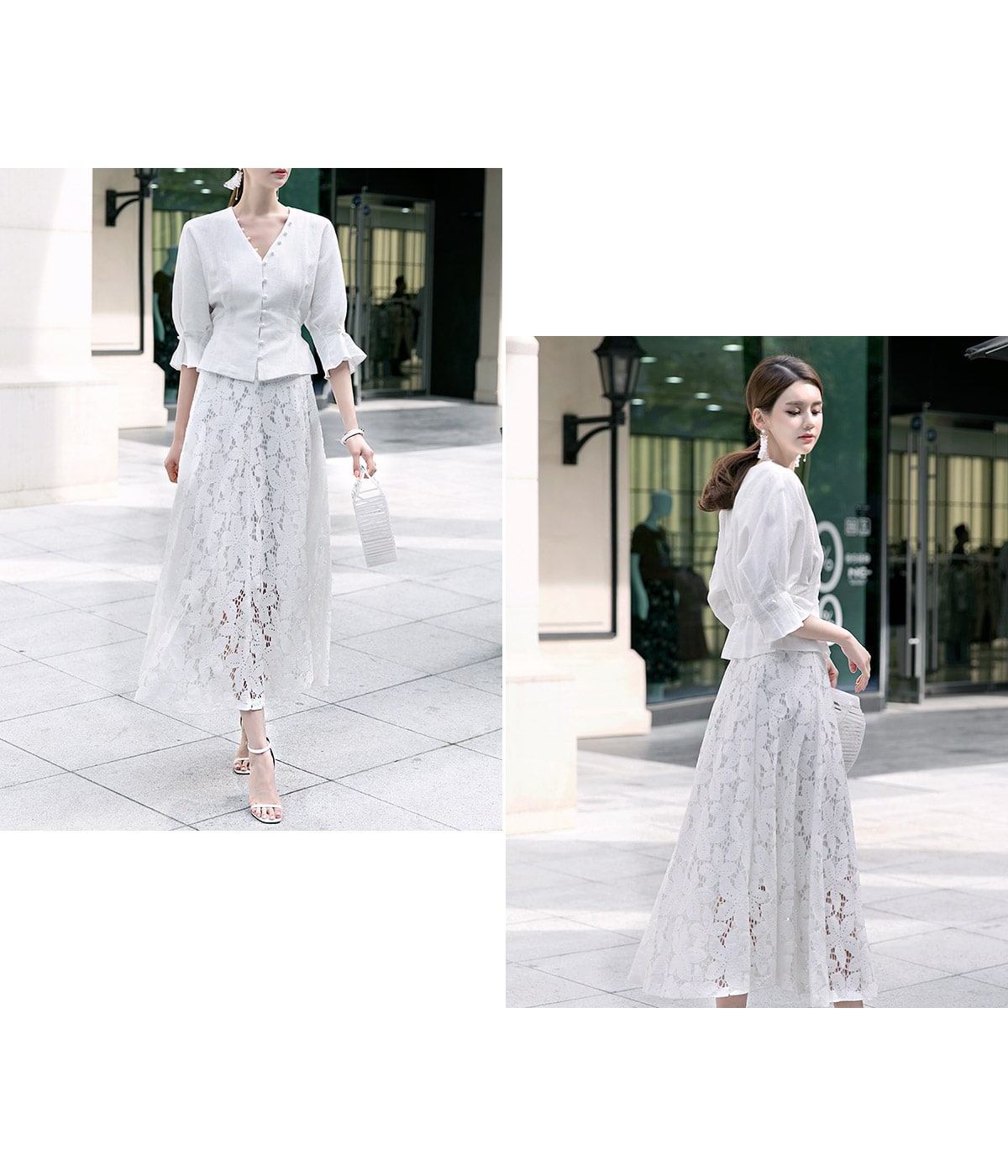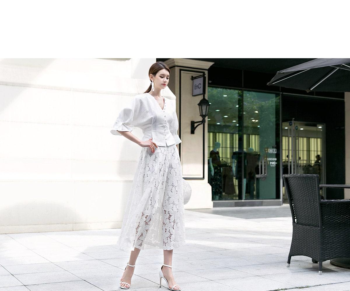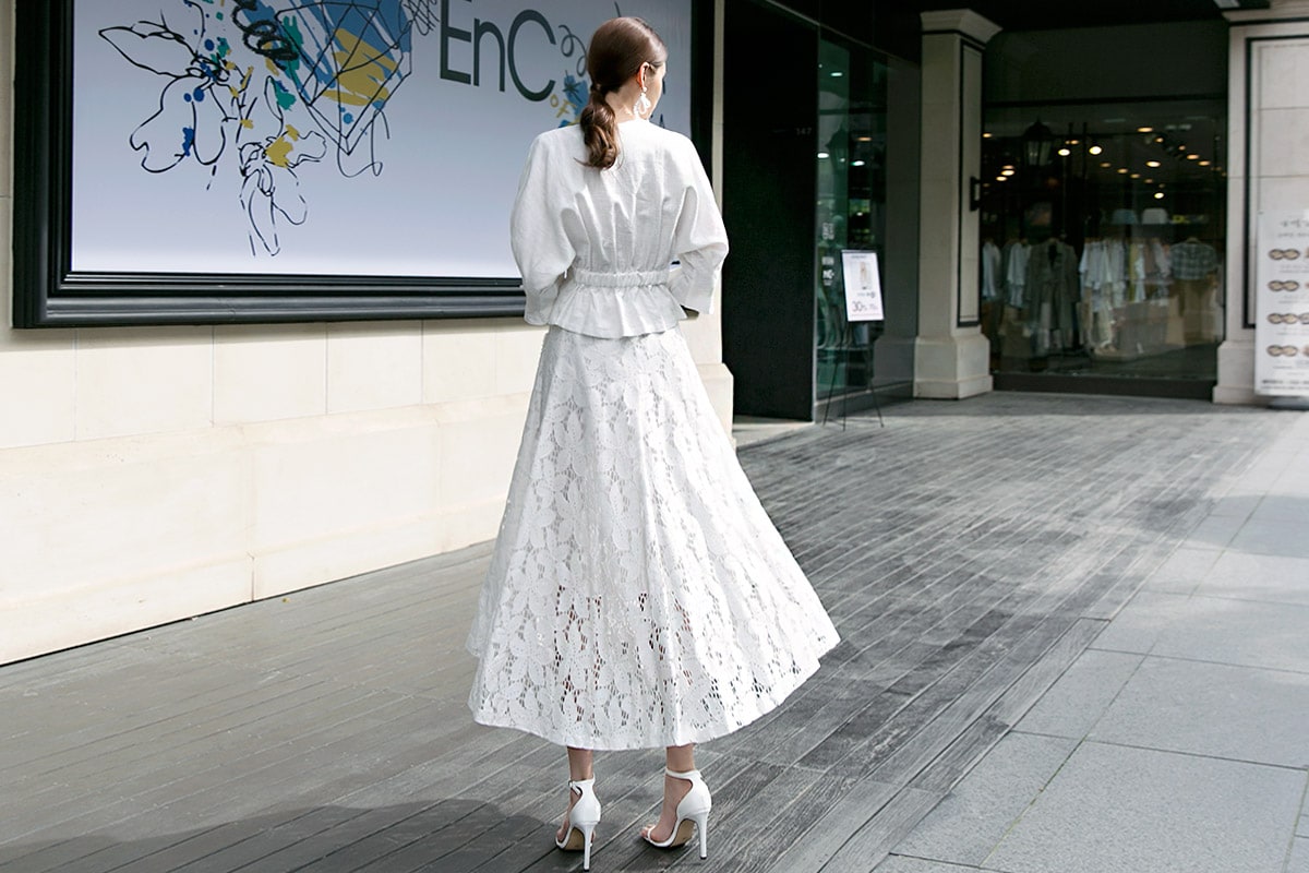 SK1720 모티브 레이스 플레어 롱 스커트 Ivory