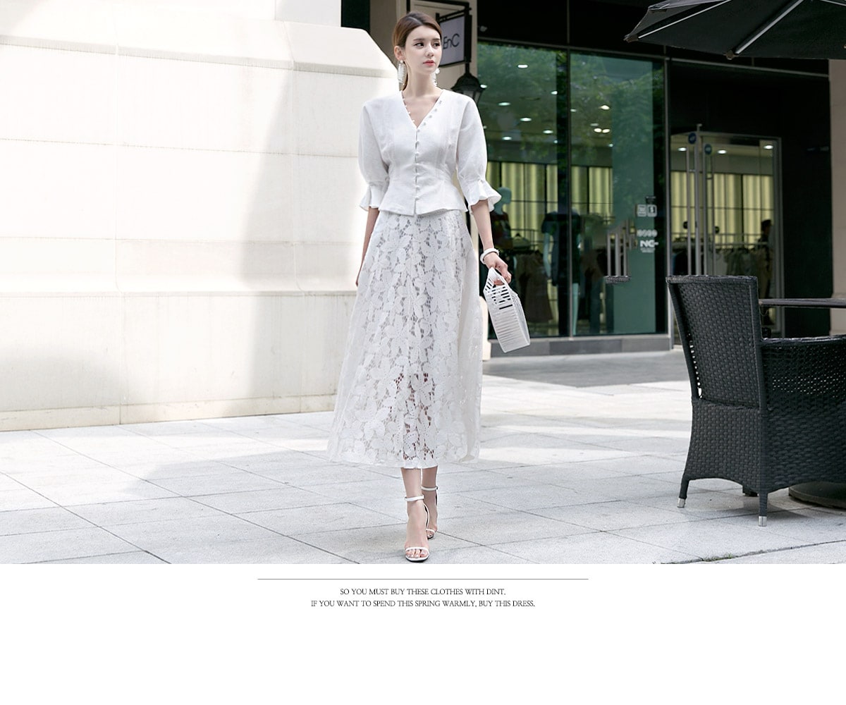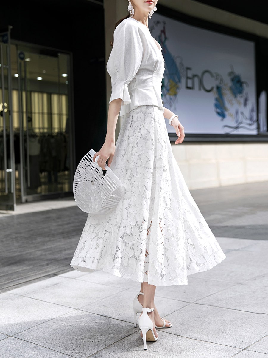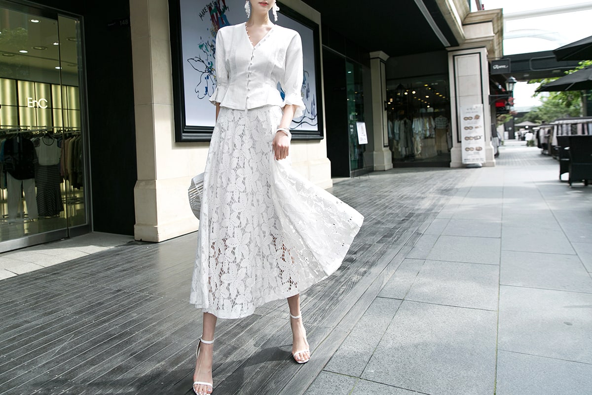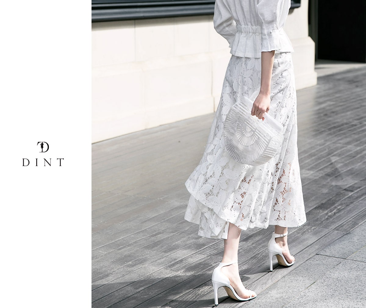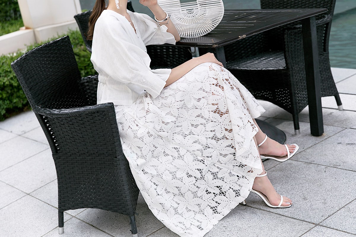 SK1720 모티브 레이스 플레어 롱 스커트 Ivory
