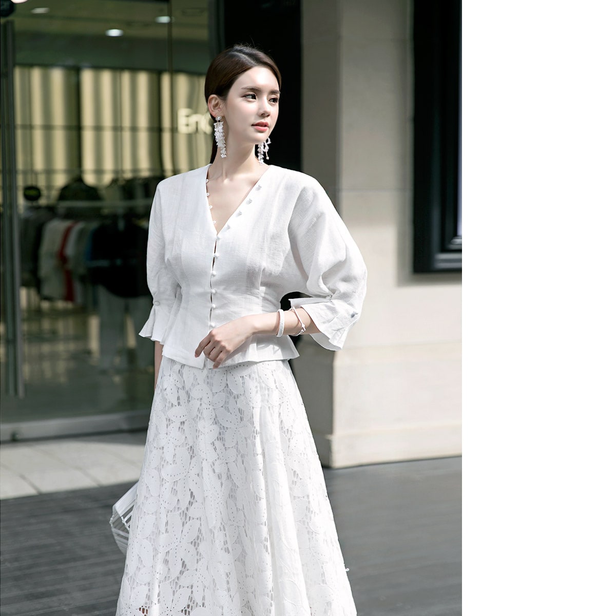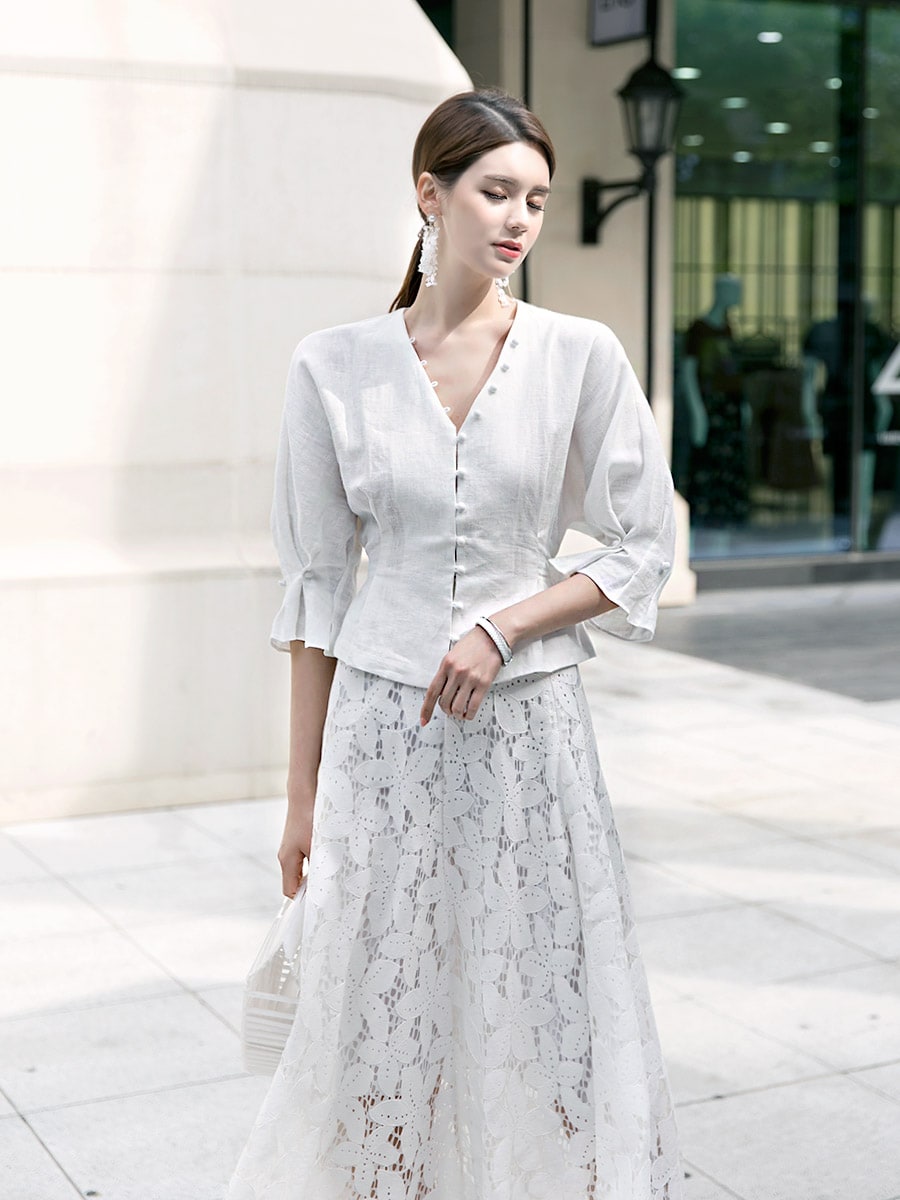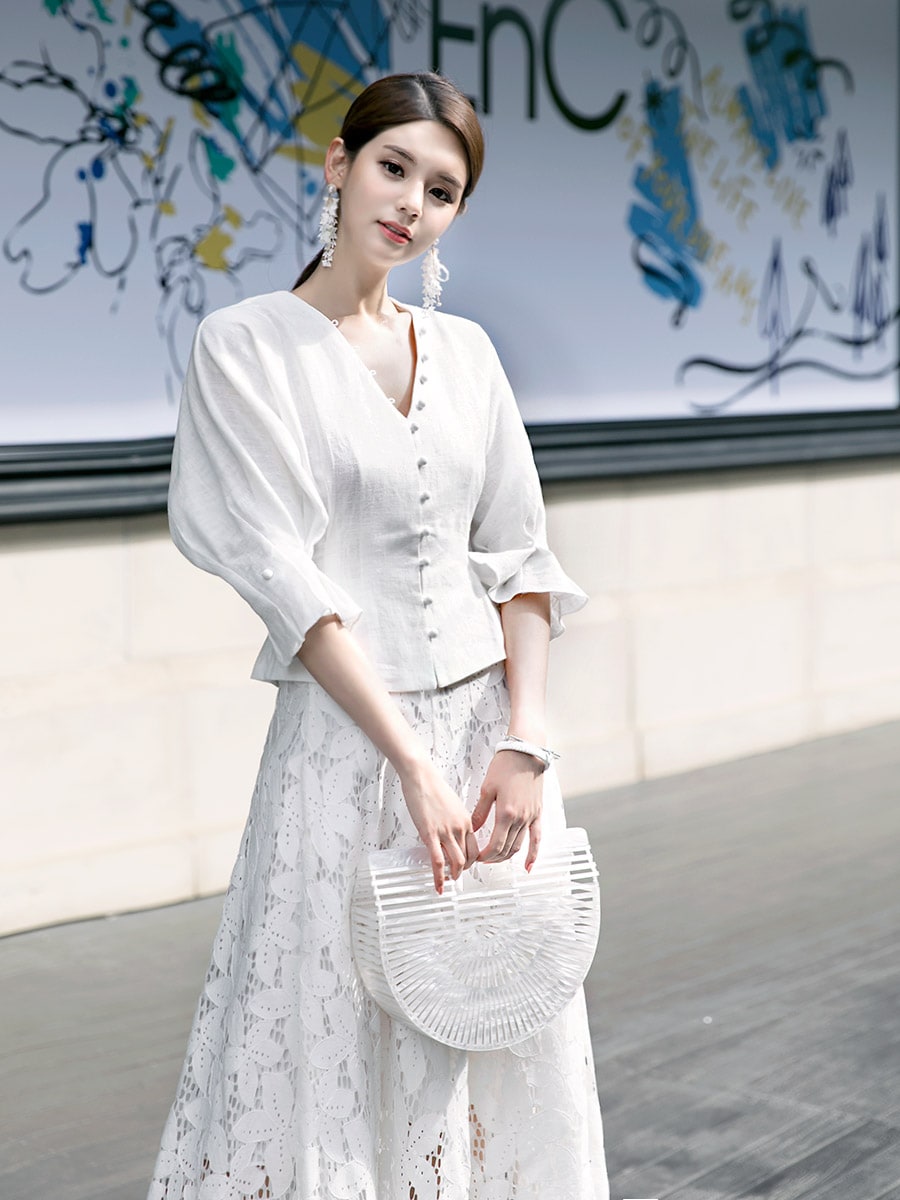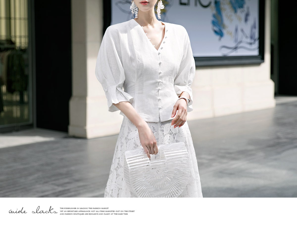 B2228 로망 버튼 라인 볼륨 블라우스 Ivory
