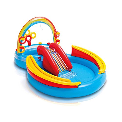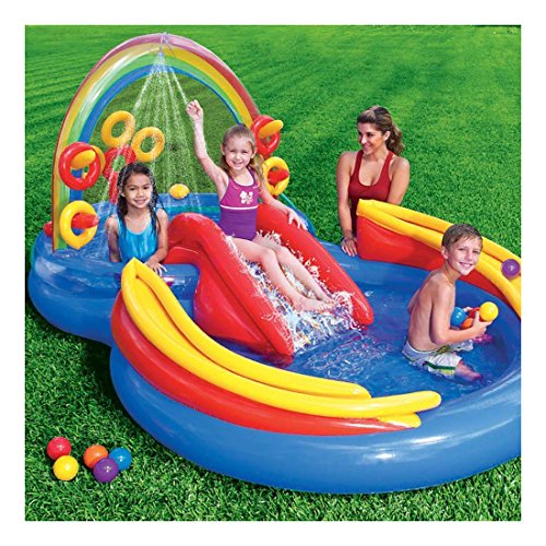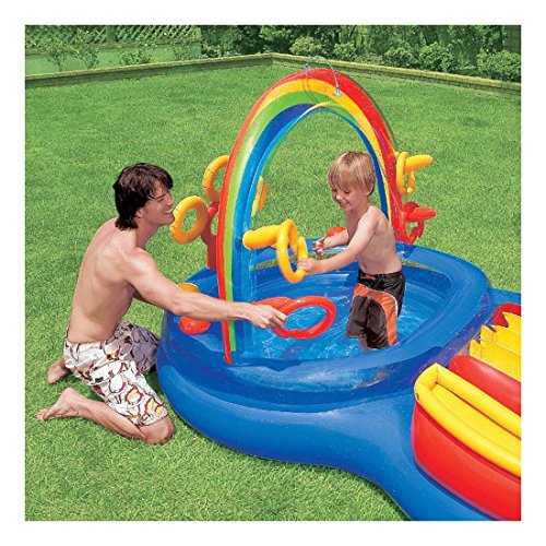 Studio : na Publisher : na Binding : Toy Product Description Your little swimmers will have a spectrum of colorful fun with this Intex Inflatable Rainbow Ring Water Play Center. This swimming pool is filled with fun. It has a slide, ring toss game, ball roller game, ball toss game, water sprayer, and comes with 6 colored balls. This play center is for swimmers ages 2 and up and keeps children playing for hours on end. There is a wading pool and a main pool and room for 5 to 6 little ones. Summer should be full of fun, sun, and splashing around in the water. This Intex Inflatable Rainbow Ring Water Play Center is perfect for cooling off and playing games with your little friends. 0