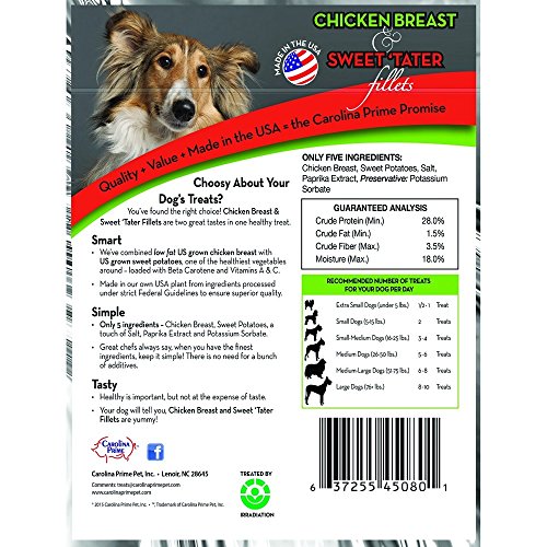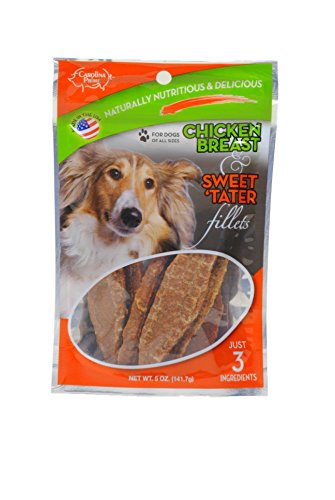 -. Binding : Misc. -. Brand : Carolina P.R.Ime Pet -. Feature : Chicken Breast & Sweet Tater flavor / Locally sourced Chicken and sweet potatoes / Loaded with beta carotene and vitamins A & C / Two great tastes in one healthy treat / Great for dogs of all sizes -. Label : Carolina P.R.Ime Pet -. Manufacturer : Carolina P.R.Ime Pet -. MPN : 637255451006 -. PackageQuantity : 1 -. PartNumber : 637255451006 -. ProductGroup : Pet Products -. ProductTypeName : PET_SUPPLIES -. Publisher : Carolina P.R.Ime Pet -. Studio : Carolina P.R.Ime Pet -. Title : Carolina P.R.Ime - Chicken Breast & Sweet Tater Fillets (1lb.) - Naturally Nutricious Dog Treats