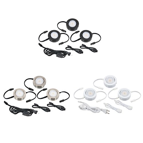 American Lighting MVP-3-WH LED MVP 3-Puck Light Kit with Roll Switch and 6-Foot Power Cord, Dimmable, White. New high performing, easy to install puck lights have a swivel feature offering over 200 lumens per puck without the need for a driver! MVP puck lights are designed for versatility - choose between recess or surface mounting! Kit includes; (1) 6-foot power cord with roll switch, (2) pucks with a 6-inch lead wire and 6-inch tail wire, (1) puck with a 6-inch lead wire and mounting screws. Warm white LEDs (2700K) with 90CRI mimic incandescent, using only 4-watts each versus 20! Each puck delivers over 200 lumens - over twice as bright as Xenon or Halogen puck lights. Pucks are dimmable with most CFL/LED and low voltage electronic dimmers (10-100% light control). Construction: Zinc alloy light housing with aluminum heat sink. Spring steel clips secure housing into surface collar with a snap-fit, and retain recessed pucks securely in place. Polycarbonate lens diffuses light. Link up to 20-pucks to a single power supple. Adaptable design allows daisy chain installation with or without linking cables between pucks. Hardwire box can be ordered a la carte, offering two 5A connection ports for larger installations. Plug-in installations can be controlled by inline roll switch on power cord; hardwire boxes are controlled by wall switch or dimmer. Founded in 1989, American Lighting, Inc. manufactures a wide range of lighting solutions for your residential, commercial and specialty lighting needs. We pride ourselves in being a lighting solutions provider by offering our customers a broad line of innovative and high quality lighting products. Continued innovation is a core strategic initiative at American Lighting, and we are committed to developing new products by utilizing the latest lighting technologies and designs. We pledge to deliver superior customer service by employing and training a team of highly experienced lighting professionals.Feature