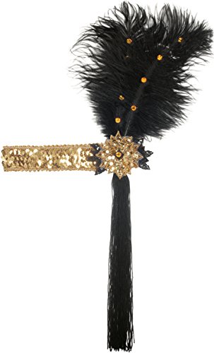 -. Title : Star Power Sequined with Feather Flapper Headband, Black Gold, One Size
