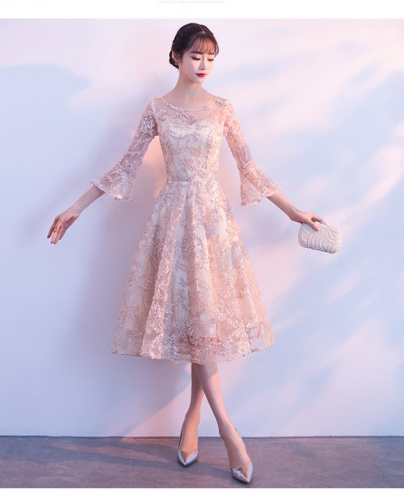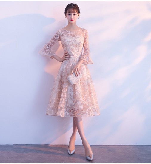 ミモレ丈の、七分袖パーティードレス。
