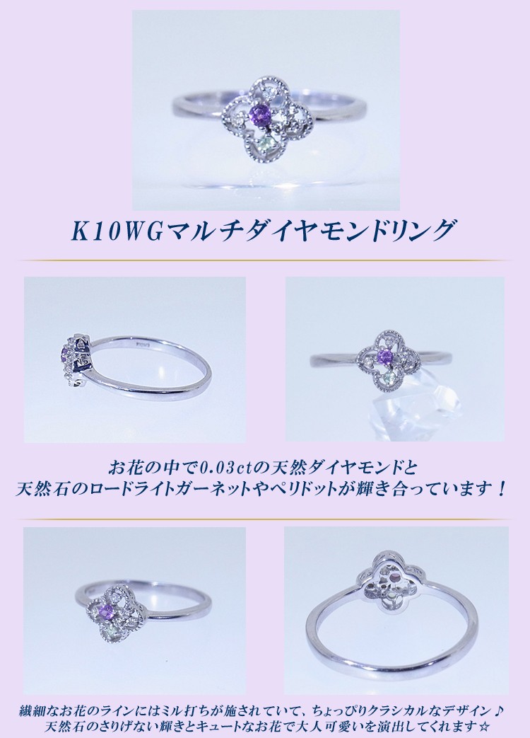 商品説明 お花の中で0.03ct天然ダイヤモンドと天然石ロードライトガーネットやペリドットが輝き合っています。ホワイトゴールドのマルチダイヤモンドリングです。