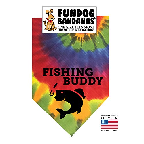 -. Binding : Misc. -. Brand : FunDog Bandanas -. Color : Tie Dye -. EAN : 0083351957117 -. Feature : Cute! / Fun! / Affordable! / Makes a great gift! / 22x22x31inches -. Label : The Dog Perk Corporation -. Manufacturer : The Dog Perk Corporation -. PackageQuantity : 1 -. ProductGroup : Pet Products -. ProductTypeName : PET_SUPPLIES -. Publisher : The Dog Perk Corporation -. Size : One size fits most for medium to large dogs -. Studio : The Dog Perk Corporation -. Title : BANDANA - Fishing Buddy for Medium to Large Dogs - tie dye with black ink -. UPC : 083351957117