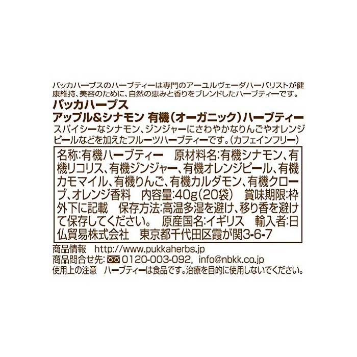 원재료:유기 시나몬,유기 re《고리스》,유기 진저,유기 오렌지 pea《루》,유기 카모 마일,유기 사과,유기 카더멈(생강과의 다년생 식물),유기 크로《―부》,오렌지 향료