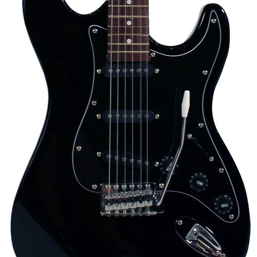 - Feature : Basswood Body with Black Finish and 3-Ply Black Pickguard / Maple c-shape neck with Rosewood fingerboard, 21 medium jumbo frets, and Dot position inlays / 25.5" scale length; 42 mm nut width / 5-way selector switch, Synchronous tremolo bridge, 3 single-coil pickups: 1 master volume, 2 tone controls / Includes: ChromaCast Clip-On Tuner, Strap, Pick Sampler, Stand, 10ft Cable, 10-Watt Amp, Padded Gig Bag & Online Lesson. (Tuner, picks & cable colors may vary.)