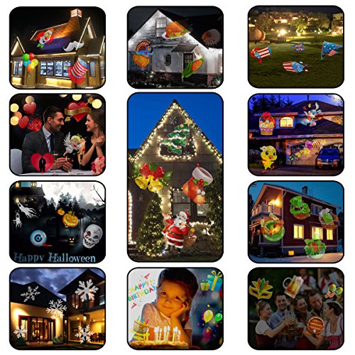-. Feature : ★16pcs Seasonal Slides - Halloween,Thanksgiving,Christmas,White Snowflakes,St.Patrick's Day,Easter Day,AP.R.Il Fool 's Day,Independence Day,Valentine's Day,Father's Day,Mother's Day,Carnival Series,Birthday,Marine animals,Night Sky,Summer beach / ★Easy installation- comes with a round base and a long ground stake; The projection light can be staked into the ground; With the stake removed, it can also be mounted to a structure using a sturdy hanging clamp and safety cable. Place light approximately 12 to 16 feet from the projection surface after the light is turned on you may need to adjust the distance to get the best results / ★IP65 Waterproof -Aotop LED Motion Projector is built to withstand the weather. Whether there's rain or snow, you can make your home sparkle any time / ★Multi-Operating Modes - There is a switch button at the bottom of the host, press the switch to change mode:ON/OFF, Flash (+,-), Speed (+,-), Fixed. Automatic timer which built in daily 6-hour on, 18-hour off cycle. / ★More Brightness and Clarity - interchangeable Fun Colorful projection images instead of black or white images; Gentle soft led light, better to protect eyes especially for kids and enjoy your day.