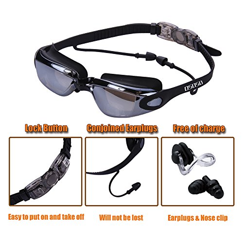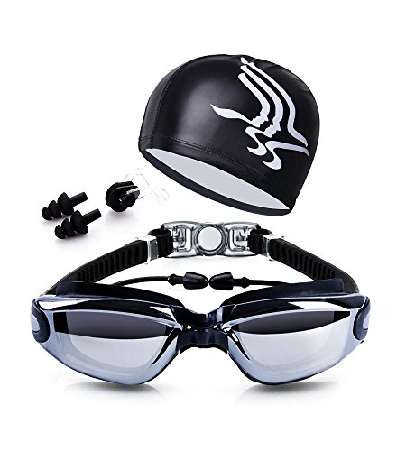 Swim Goggles + Swim Cap + Case + Nose Clip + Ear Plugs,Dsoso Clear Swimming Goggles Coated Lens No Leaking Anti Fog UV Protection for Adult Men Women Youth Kids Child,Black