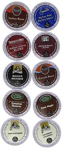 Sampler contains 2 each of Tully's French Roast, Tully's Italian Roast, Van Houte Napoletano, Van Hotte Mexico, Green Mountain Dark Magic, Green Mountain Sumatra, Wolfgang Puck Colombian Reserve, Diedrich French Roast, Newman's Own, and Van Houtte Colombian Dark