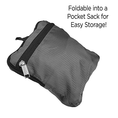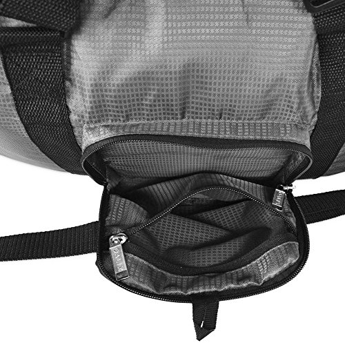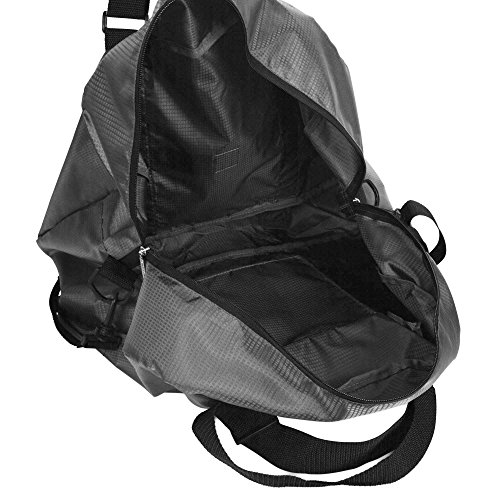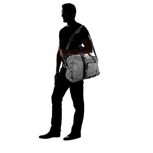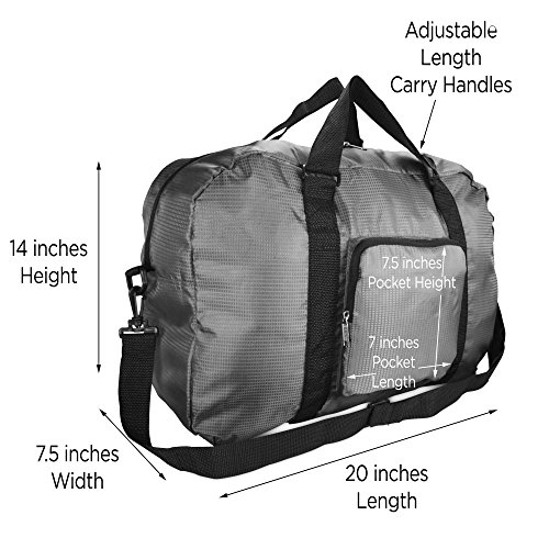 Product Description Our Dalix Foldable Portable Duffle Bag is ideal for any travel occasions. This bag can store your shoes, change of clothes, socks, towels, or anything you need to bring with you along your trip. Not only does it pack, but it shrinks down to store easily also: you can fold this bag and roll it up into its Front Zipper Pocket, which also acts as a pouch for portability. Once you need the bag again, just flip the pocket inside out and the duffle bag unravels quickly! For ease of use and comfort, it features adjustable hand straps to extend or shorten in case you wish to quickly sling on and carry and also includes a shoulder strap which links onto each side of the bag . Another great feature is the velcro strap on rear side of the bag which can be used to attach on rolling luggage handles as you travel! MATERIAL: Polyester . FEATURES: Foldable portable into the front pocket, shoulder strap for ease of use, adjustable hand straps for quick carry purposes, Front Zipper pocket for additional storage, rear velcro straps for luggage attachment. SIZE: 20 in. (length) x 7.5 in. (width) x 14 in. (height). COLORS: Black, Gray . INTENDED USE: Travel, gym, sports, storage, organization 0