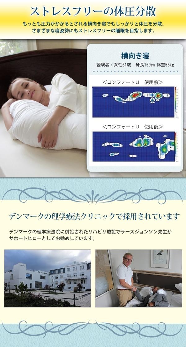 | コンフォートUはさまざまな形にアレンジして使用することが出来る枕です。横向き寝だけでなく、あらゆる寝姿勢をサポートする形状にあります。 睡眠だけでなく、ストレッチなどにも活用していただけます。 |