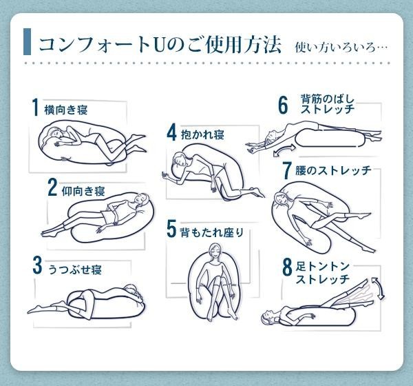 コンフォートUはさまざまな形にアレンジして使用することが出来る枕です。横向き寝だけでなく、あらゆる寝姿勢をサポートする形状にあります。 睡眠だけでなく、ストレッチなどにも活用していただけます。 |