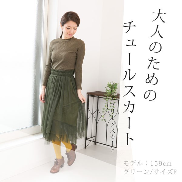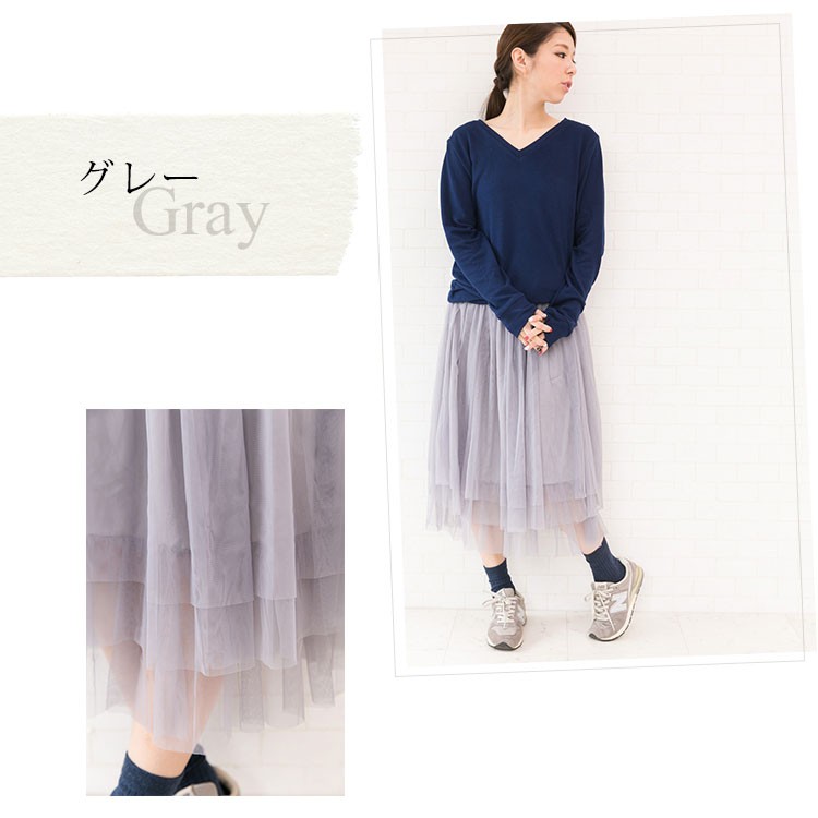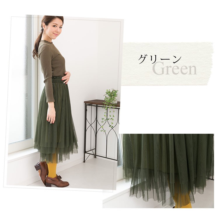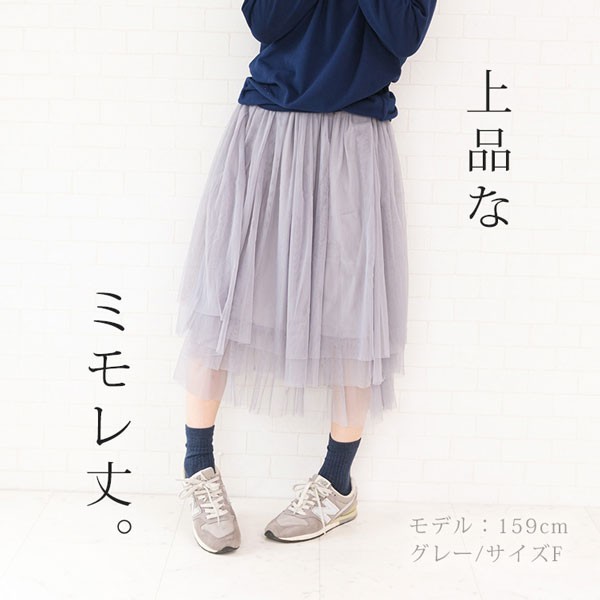 | 商品説明 | ミモレ丈 フェミニン フレアチュールスカート♪ ウエストゴムで楽チンな履き心地のスカートです。 適度なボリューム感でカジュアルコーデにもマッチします♪ |