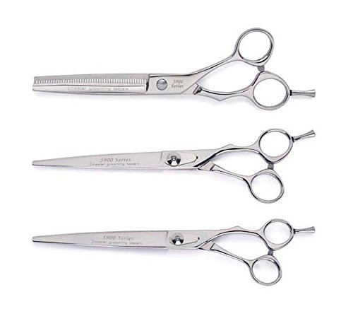 Studio : UnBranded Publisher : UnBranded Binding : Misc. Product Description 5900 Japanese Dog Grooming Shear KitThe 5900 Japanese Stainless Steel Value Kit is the smart way to buy scissors for your grooming shop. This set of three dog grooming shears includes one each of the 7½ and 8½ straight shears, and a 6½ 46-tooth thinning shear.Made with Japanese 440C Cobalt Stainless Steel, these new 5900 Japanese Stainless Steel Shears have a Rockwell Hardness Rating of 59 and are ultra-sharp. - Micro-serrated edges hold hair in place while scissoring