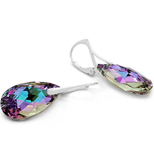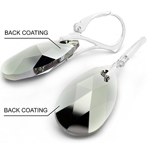 The lever-back earrings and the pendant are dazzling with Swarovski crystals and they are set in sterling silver. The 925 stamp visible on the findings, stands for the fact that 92.5% of it is pure silver and the other 7.5% is copper which gives durability and workability to the silver. The crystals (also known as Swarovski elements) have the highest lead content, 30+% which allows them to pick up even more light to refract, hence improving the fire and sparkle even more and look beautiful.