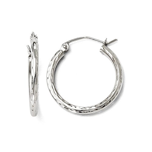 Traditional yet distinctive, a hollow round hoop silhouette measuring 2mm in width featuring a textured design that is approximately 20mm (3/4 inch) in diameter. They are fashioned from polished 14k white gold and finished with snap-down hinged posts that are comfortable and secure.Feature