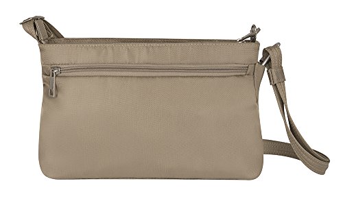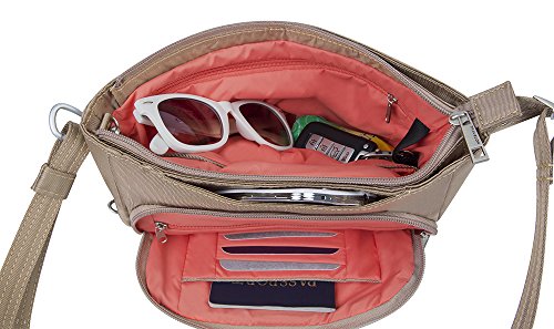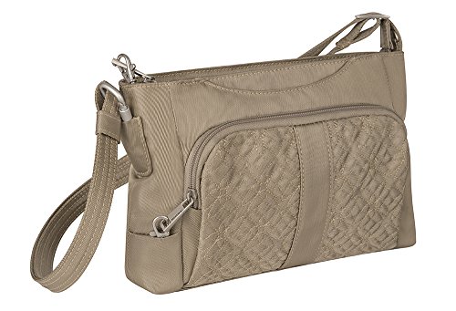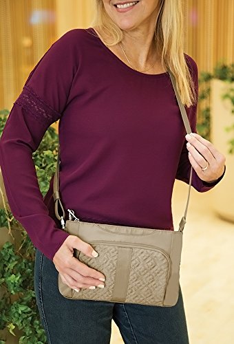 -. Binding : Apparel -. Brand : Travelon -. Department : womens -. Feature : Roomy main compartment with wide zip opening provides full access / Includes 2 slide pockets and zip wall pocket / Zip front compartment has RFID blocking card and passport slots and zip wall pocket / Full-length rear zip pocket / Front drop pocket for smartphone -. Label : Travelon -. Manufacturer : Travelon -. NumberOfItems : 1 -. PackageQuantity : 1 -. ProductGroup : Apparel -. ProductTypeName : LAGE -. Publisher : Travelon -. Studio : Travelon -. Title : Travelon Anti-Theft Signature E/W Slim Shoulder Bag
