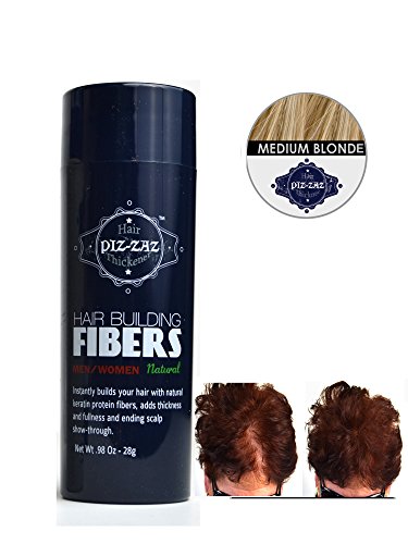 -. Binding : Misc. -. Brand : Piz-zaz Hair Fibers -. Color : Medium Blonde -. EAN : 0810322025335 -. Feature : container 28 Gram / Simple and easy-to-use process Get great natural looking hair in a matter of minutes. / Even those closest to you won't be able to tell the difference between your and the Piz-zaz product / Great for all types of hair-male or female / Easy to wash out and no stains! -. IsAdultProduct : 0 -. Label : Piz-zaz Hair Fibers -. Manufacturer : Piz-zaz Hair Fibers -. Model : md blonde -. MPN : PZ -. PackageQuantity : 1 -. PartNumber : PZ -. ProductGroup : Beauty -. ProductTypeName : BEAUTY -. Publisher : Piz-zaz Hair Fibers -. Studio : Piz-zaz Hair Fibers -. Title : Piz-zaz Hair Building Fibers All Natural Thickening System Instantly Conceal Balding 0.98 Oz in "Md Blonde " -. UPC : 810322025335