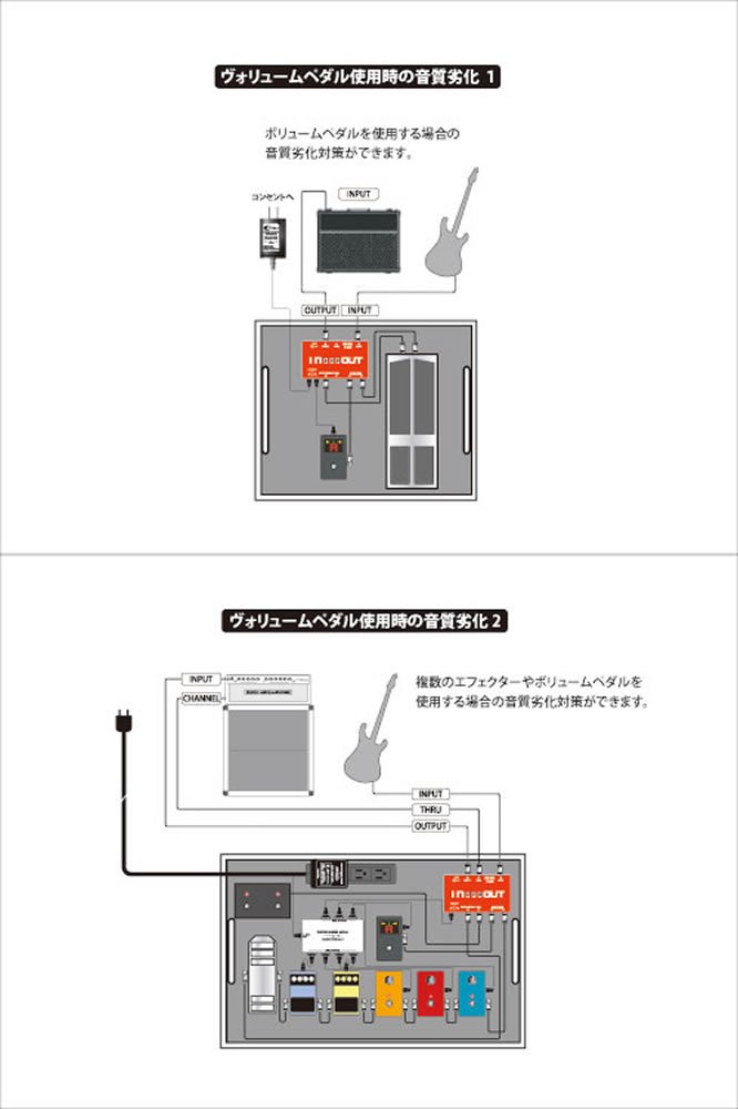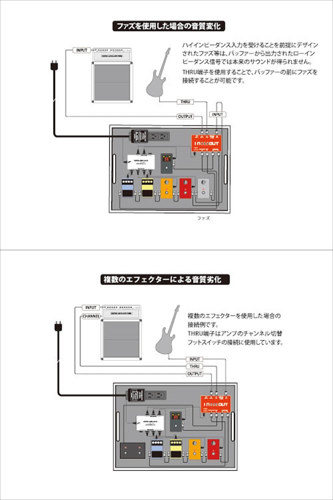 The high impedance signal outputted from the passive pickup of the guitar firmly guards the original sound from signal deterioration and noise caused by the use of the effector and the volume pedal.