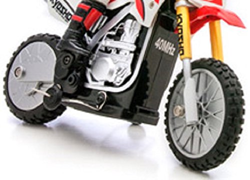 【ジャイロ搭載で驚異の2輪走行!コーナリングも安定走行】 【生活防水・防塵+サスペンションだから、思いっきり楽しめる】 ●リアルなライダーフィギュアと、サスペンションを深くストロークさせながらの走りは、まるでホンモノ! ●超安定の2輪走行の秘密は、内蔵されたメカニカルジャイロ。確かな働きで、倒れず走れる驚きの機能を発揮。高速から低速まで、そして左右にバンクしながらのコーナリングもお手のもの! ●さらに生活防水・防塵設計だから、少々の水たまりや、砂ぼこりもノープロブレム! 倒れないように補助するサポートローラーが、走行トレーニングをバックアップ。慣れてくれば外して、完全2輪走行にチャレンジ。アウトドアで、マジカルなモトクロスランを、思いっきり楽しもう! 【走るのに必要なもの】 ●送信機用006P-9V乾電池1本 ●車体用単4アルカリ乾電池4本Feature