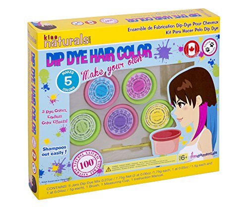 Fundamentals Toys Kiss Naturals 8-Piece DIY Dip Dye Hair Color Kit with 5 Jars of Dye Mix. With five outrageous colors included, you can be sure to find lots of combinations that you'll love. Mix, match, layer or go ombre or balayage - it's all up to you! The special formulation works by coating your hair so it washes out easily and works on both light and dark hair, with different effects depending upon you shade of hair color. Age - 6 and up. Includes 5 Jars Dip Dye Mix, 1 Brush, 1 Measuring Cup, and 1 Instruction Manual. WARNING: CHOKING HAZARD -- Small parts. Not for children under 3 yrs. Materials: Water, Plastic, Dye Dimensions: 10.5"L x 12"W x 2"H Weight: 0.91 lbsFeature