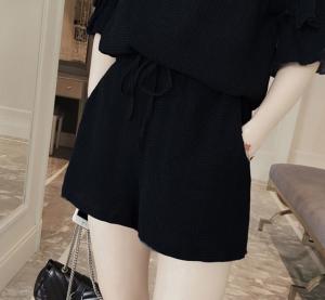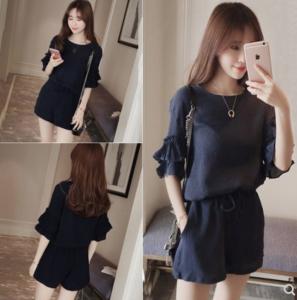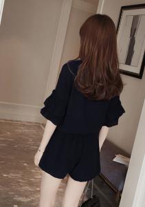セットコーデ 大人カジュアル プチプラ シンプル ハイウエスト 袖フリル ショートパンツ ポケット ネイビー