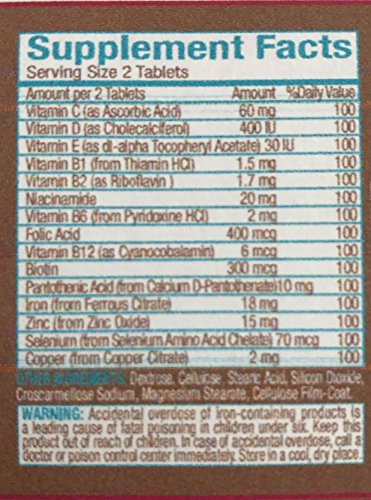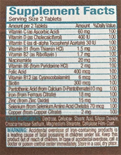 Hair Vitamin Is designed to provide 100% of the DV (Daily Value) of vitamins and minerals to maintain healthy hair. Healthy hair begins from the inside out. Key Distinctions: 1. 100% of the DV (Daily Value) for essential vitamins and minerals needed for healthy hair maintenance 2. A supplement for today's stressful livestyles and rapid diet changes 3. Provides the proper nutrients needed for hair growth 2 Tablets contain 100% of the DV (Daily Value): 60 mg Vitamin C ( as Ascorbic Acid) 400 IU Vitamin D ( as Cholecalciferol) 30 IU Vitamin E (as d.l.alpha Tocopheryl Acetate) 1.5 mg Vitamin B1 (from Thiamine HCI) 1.7 mg Vitamin B2 (as Riboflavin) 20 mg Niacinamide 2 mg Vitamin B6 (from Pyridoxine HCI) 400 mcg Folic Acid 6 mg Vitamin B12 (as Cyanocobalamin) 300 mcg Biotin 10 mg Pantothenic Acid (from Calcium D-Pantothenate) 18 mg Iron (from Ferrous Citrate) 15 mg Zinc (from Zinc Oxide) 70 mcg Selenium (from Selenium Amino Acid Chelate) 2 mg Copper (from Copper Citrate) Inactive: Dextrose 20.5 mg Cellulose 18 mg Stearic Acid 6 mg Silicon Dioxide 6 mg Croscarmellose Sodium 3 mg Magnesium Stearate Cellulose Film CoatFeature
