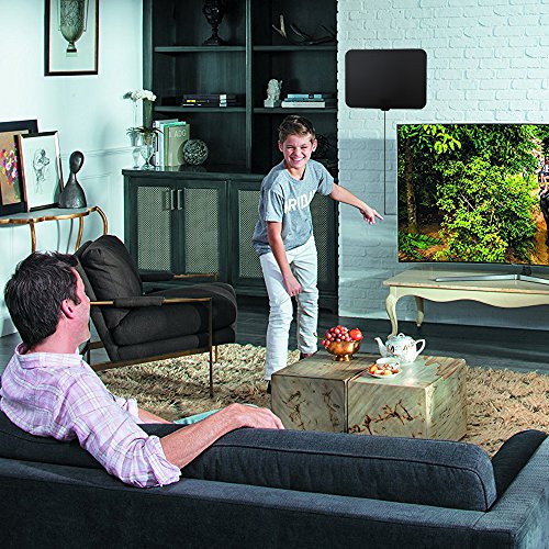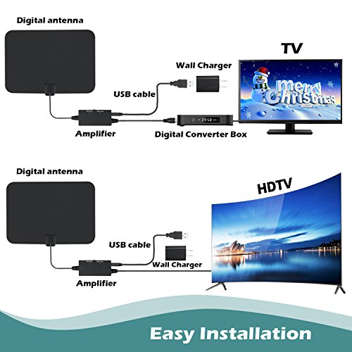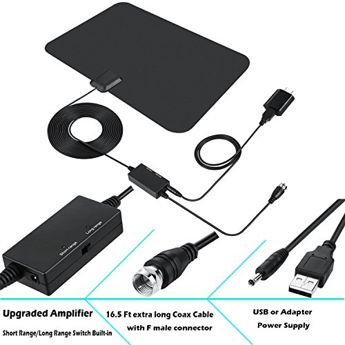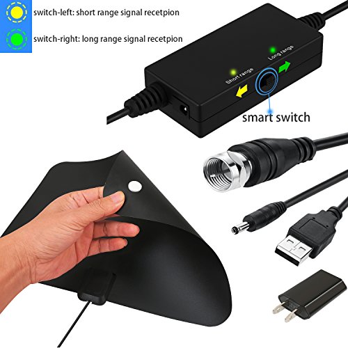 Upgraded Ultra-thin indoor amplified tv antenna 50 Mile Range hdtv antenna with amplifier booster ensure you get more national local channels and stronger signal from broadcast towers surrounding you FREE! TOP FEATURES: - Upgraded amplifier signal booster (with long/short range switch built in) hdtv antenna: Easier to install, more convenient to operate.