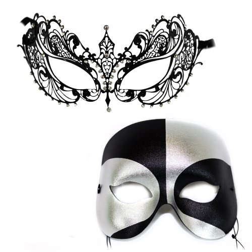 We have chosen two complimentary masks from our collection to make a "COUPLE". The price is for two masks. A laser cut metal lacy luxury masquerade mask is sprinkled with rhinestones. It secures with ribbons. The matching mask is a Classic Black and Silver Masquerade mask. It secures with an elastic band.Feature