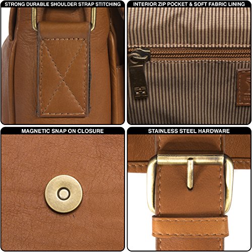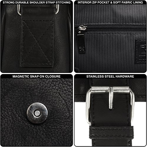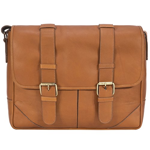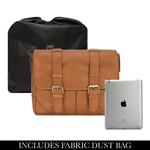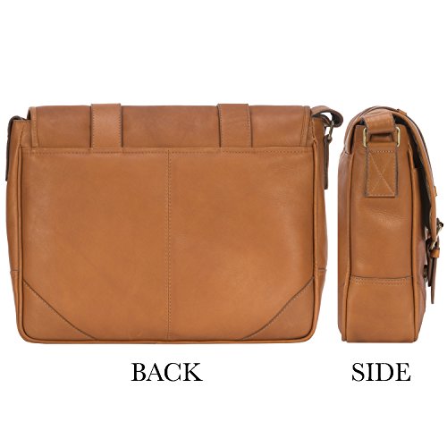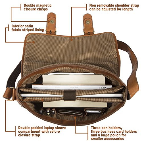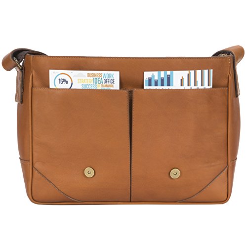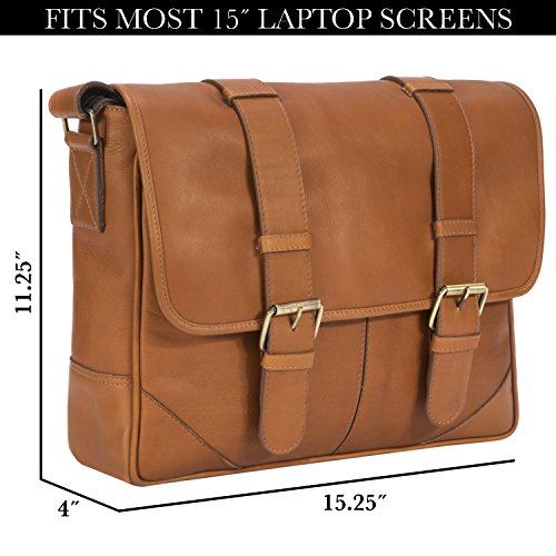 PRODUCT FEATURES: -Removable padded laptop computer sleeve -Double magnetic snap on closure tabs -Accommodates laptops up to 15" screen size -Front interior has an array of pockets for smart phone, pens, business cards and more -Two deep open pockets under the flap to store easy to access items such as electronics -Sewn in adjustable leather and nylon shoulder strap -15.25" (L) x 11.25" (H) x 4" (W)