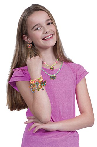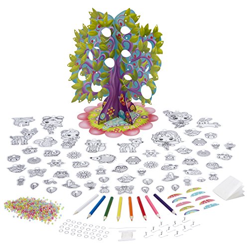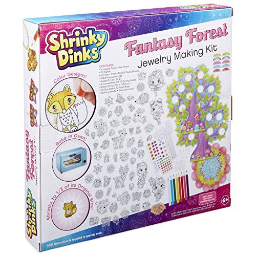 Shrinky Dinks Fantasy Forest Jewelry Making Kit is a magical way to spend a day indoors! Color, bake and shrink owls, butterflies, flowers and more. Make fantasy charms, necklaces and earrings and hang them from a tree shaped holder. Shrinky Dinks sheets are made of a special thin, flexible plastic which, when heated in an oven, shrink and harden without altering their color or shape. We precut all the fun shapes in every one of our kits to make them easy to work with! Includes 60 preprinted and precut Shrinky Dinks, 10 paperboard stands, 3-piece jewelry tree, 100 sticky gems, 0.7oz. of beads, 8 colored pencils, 10 earring hooks, 100in. elastic string, 30 glue dots, 30 jump rings, beading needle and easy instructions. Recommended for children 6 years of age and older.Feature