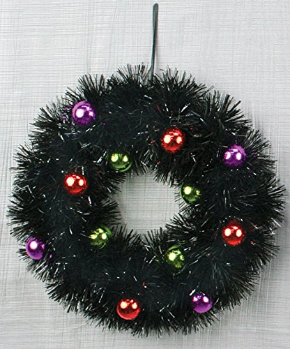 - Wreath is black with silver tinsel and pre-decorated with Halloween-colored ornaments