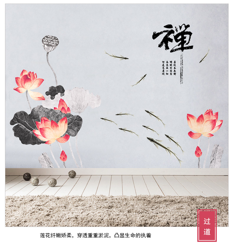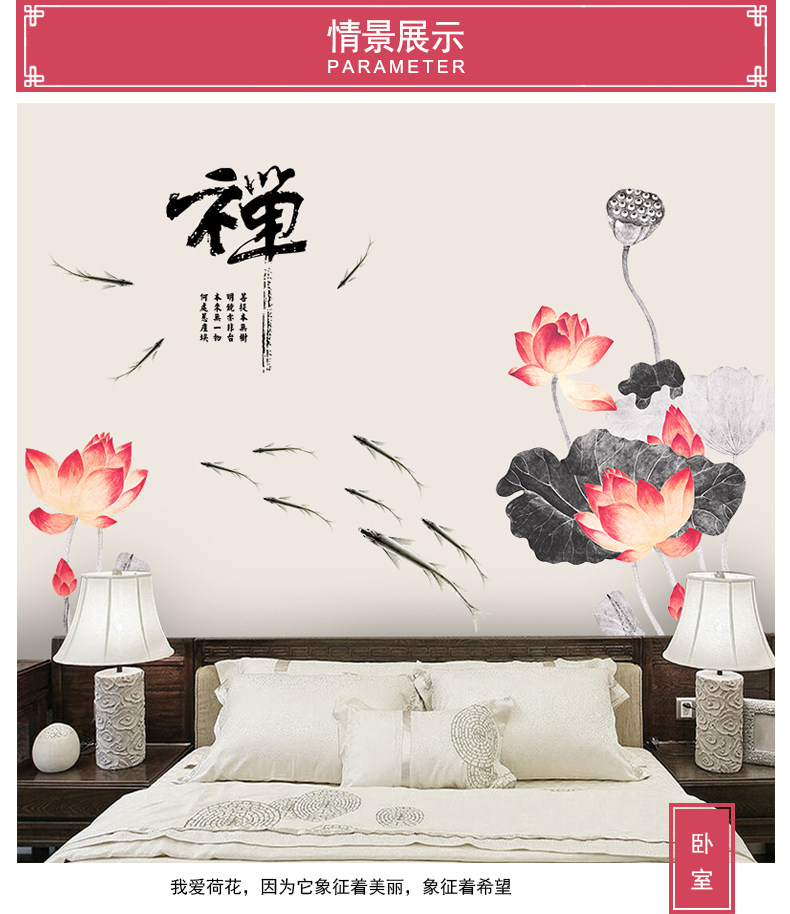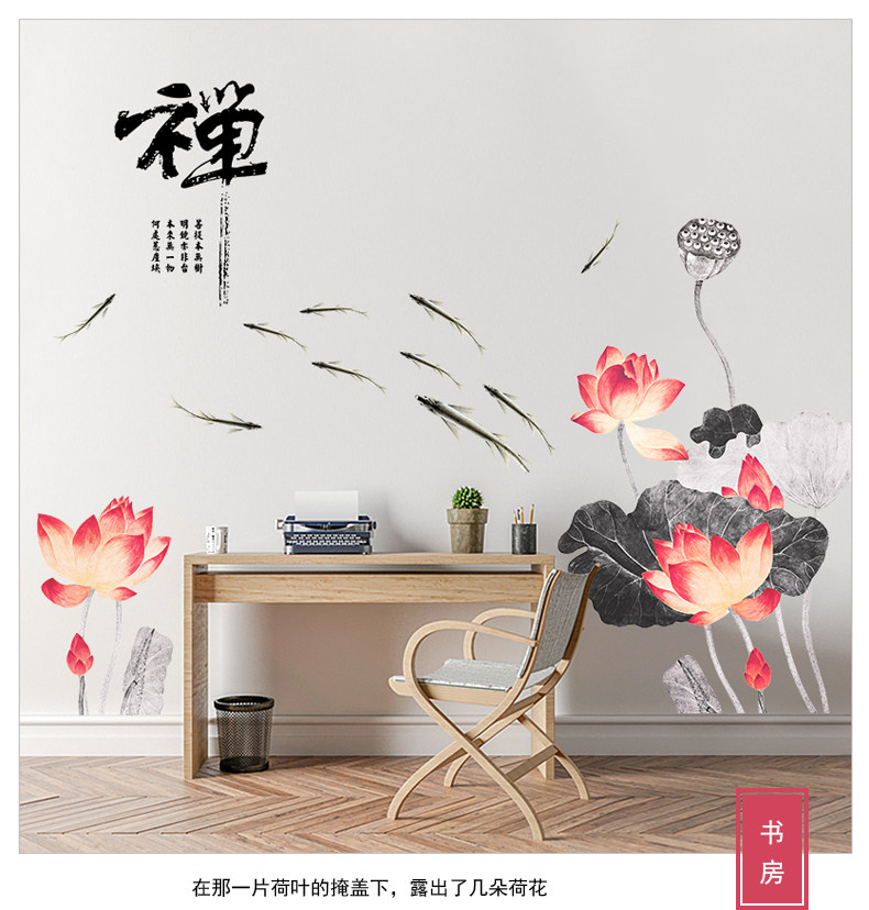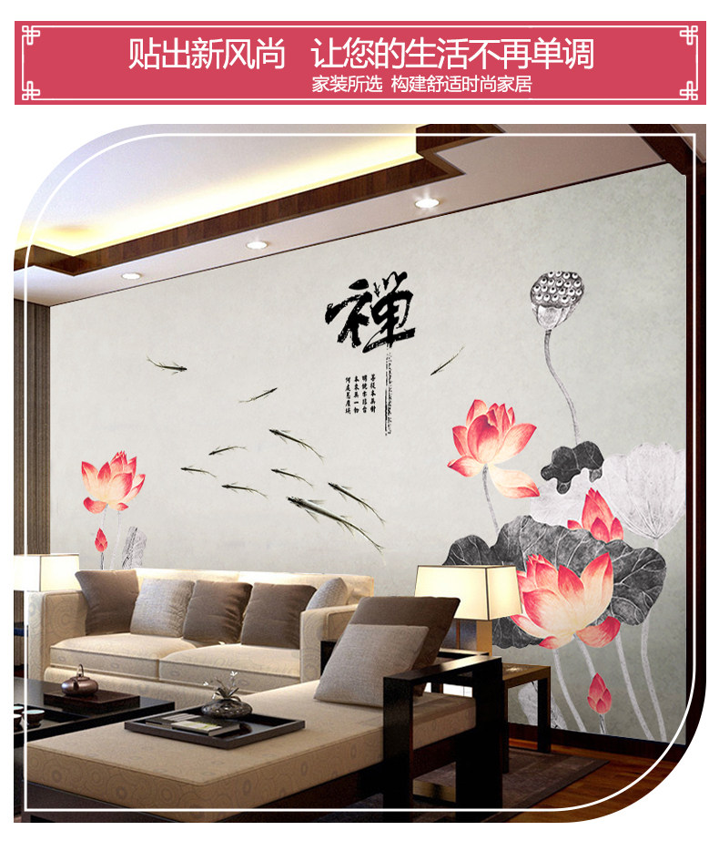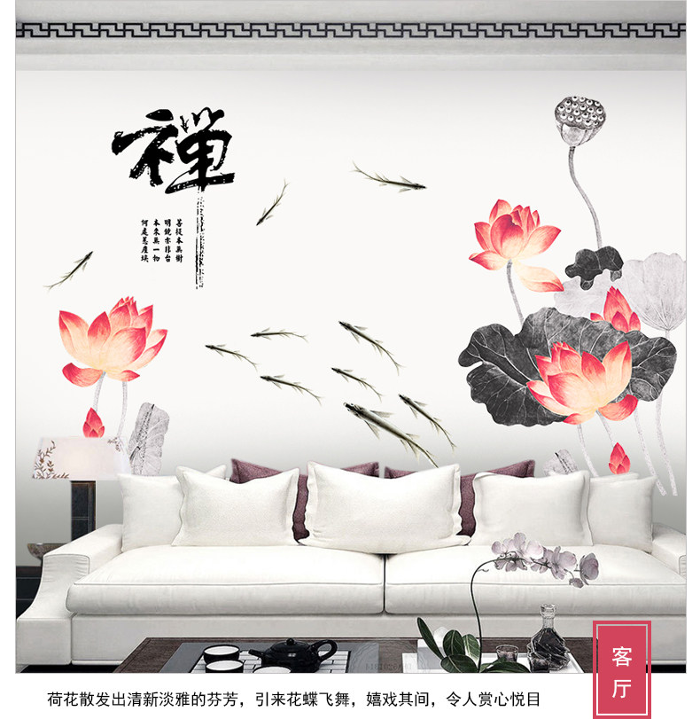 中国风禅意荷花墙贴纸客厅电视背景墙壁书房卧室装饰自粘墙纸贴画