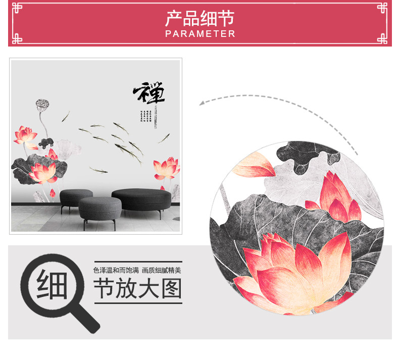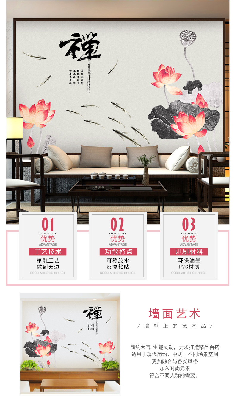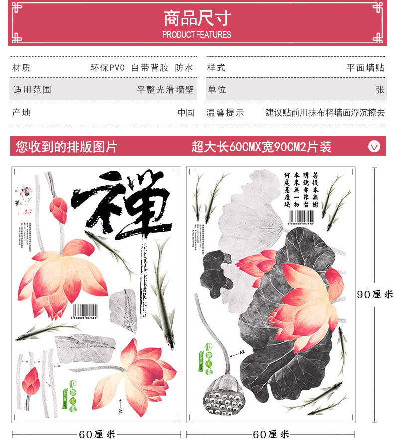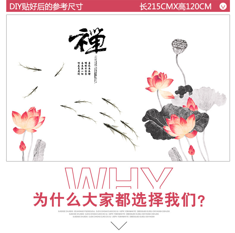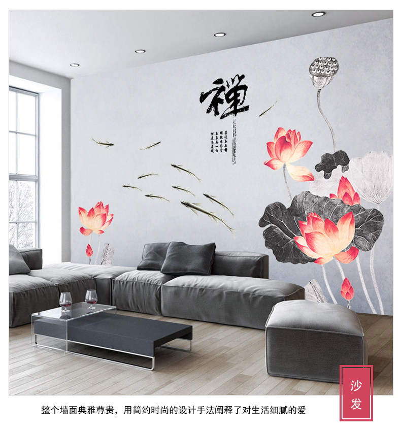 中国风禅意荷花墙贴纸客厅电视背景墙壁书房卧室装饰自粘墙纸贴画