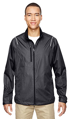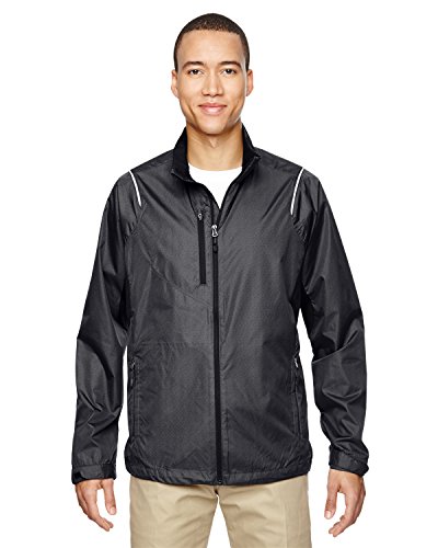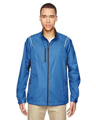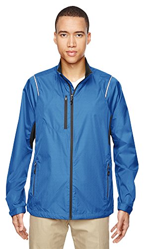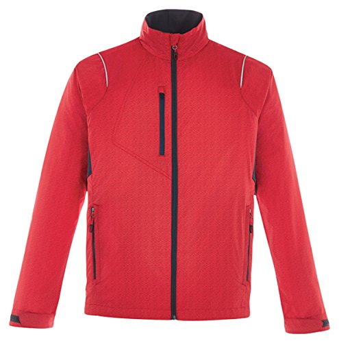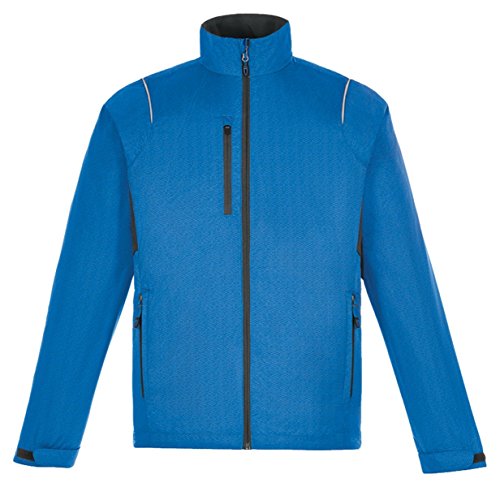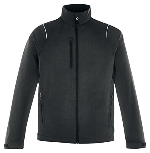 Binding : Apparel Product Description 100% recycled polyester mini dobby with print, 2.1 oz./yd2/70 gsm; inside storm placket with chin guard; centre front reverse coil autolock zipper with rubber toggle; contrast reverse coil zippered pocket on right chest ; reflective piping at front and back shoulders; back vent system for added breathability; partially exposed lower pockets with rubber toggles; adjustable shockcord at drop back hem; adjustable shaped cuffs with tabs; decorative reflective print at center back; 0