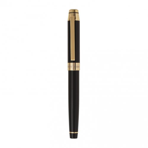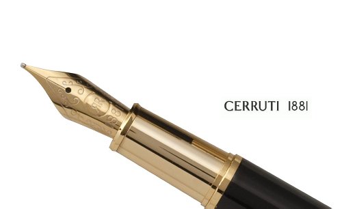 cerruti 1881 Füllfederhalter Heritage Gold. Ein Klassiker in der cerruti 1881 Schreibgeräte Kollektion. Mehrschichtig schwarz lackiert, Griffbereich vergoldet, Zier- und Beschlagteile vergoldet. Gravierte goldfarbige Flügelfeder in mittlerer Strichstärke, mit einer Iridiumspitze für sanftes und gleitendes Schreiben. PELIKAN Patronentinte. Die Verwendung eines Steckkonverters ist nicht möglich. Einzeln verpackt in der cerruti 1881 Geschenkbox.Feature