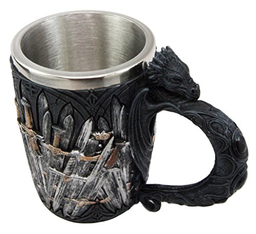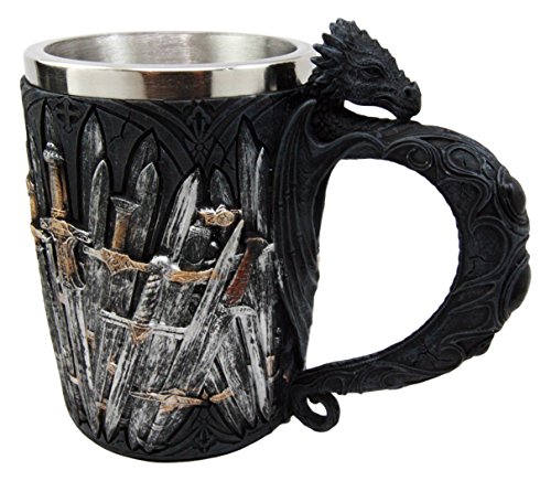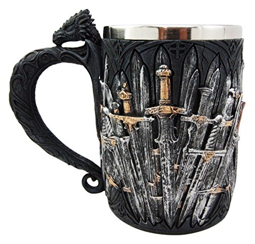 Studio : Atlantic Collectibles Publisher : Atlantic Collectibles Product Description This dragon swords mug is made of high quality resin with stainless steel liner, individually hand painted and polished. Color Tone May vary from pictures. This dragon swords mug is 5.25" tall, 6.5" wide and 4.25" deep. Mug has 13oz capacity. Hand Wash Only. This Dragon Swords Medieval mug is perfect for your medieval/renaissance themed parties! It is designed for Game Of Thrones, Might and Magic Gaming and other fantasy sequel fans. Imagine drinking out of this mug with your beer buddies, close relatives or what have you! Made of high quality polyresin, hand painted and polished, this mug is topped with a stainless steel liner for safe drinking. 0